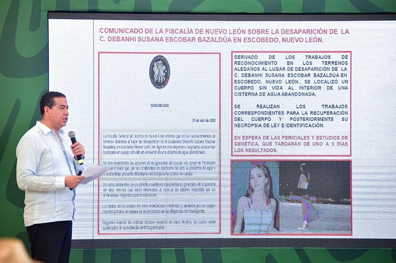 Dio a conocer que el cuerpo ya fue trasladado al Servicio Médico Forense para hacer la necropsia y así confirmar genéticamente si se trata de Debanhi Escobar. Un informe preliminar señala que encontraron un crucifijo y la ropa que vestía en la fotografía difundida.