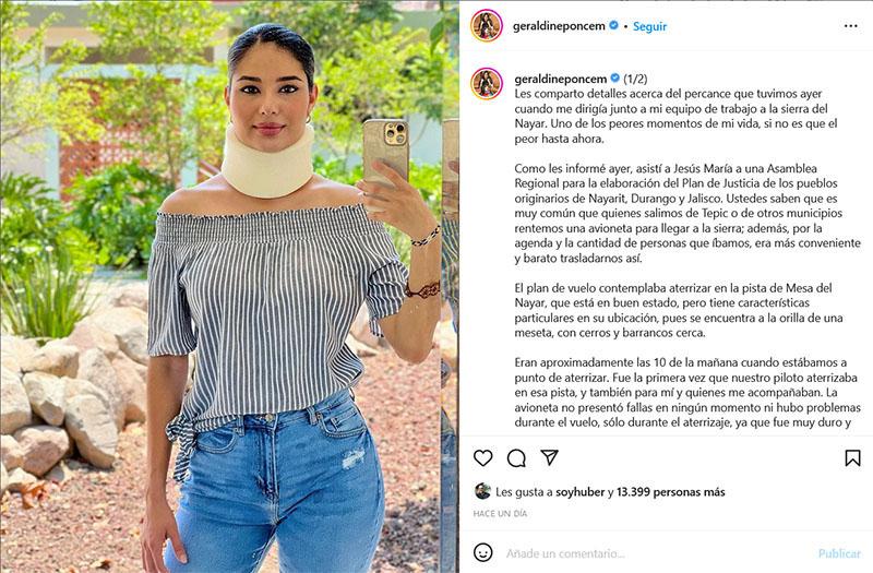 La alcaldesa de Tepic, Nayarit, Geraldine Ponce, sufrió el pasado sábado un accidente, junto con su equipo de trabajo, en la avioneta que viajaban rumbo a la Sierra del Nayar.