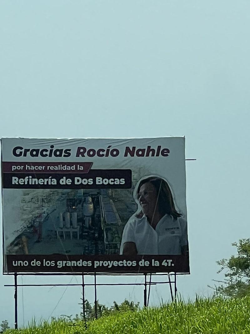 En el anunció se leen las siguientes líneas: “Gracias Rocío Nahle por hacer realidad la Refinería de Dos Bocas; uno de los grandes proyectos de la 4T”; estas son palabras son acompañadas por una foto de la funcionaria federal y de la obra en cuestión.