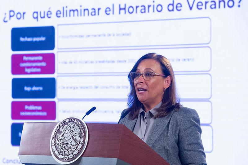 En el Salón de la Tesorería de Palacio Nacional, la titular de la Sener expuso que, de acuerdo con los resultados de la encuesta realizada en junio por la Secretaría de Gobernación, el 71 por ciento de la población no está a favor del horario de verano y solo el 29 por ciento lo aprueba.
