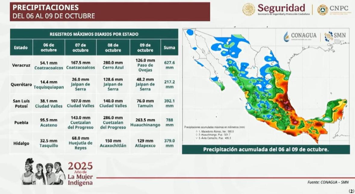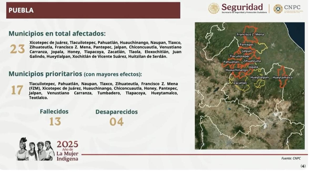 La coordinadora Nacional de Protección Civil del Gobierno de México, Laura Velázquez Alzúa, informó que, lamentablemente, en Puebla asciende a 13 personas fallecidas y se tienen 4 no localizadas. Resaltó que hay 23 municipios afectados y 11 son los de mayor daño, enfatizó que nadie quedará desamparado.