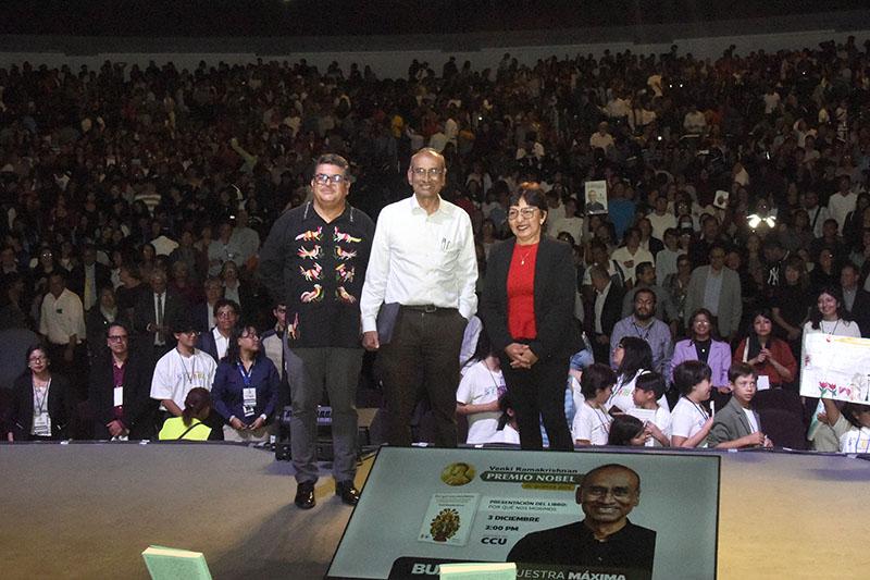 Ante más de tres mil personas que acudieron al auditorio del Complejo Cultural Universitario de la BUAP, el premio Nobel de Química 2009, Venki Ramakrishnan, expuso sus principales motivaciones para ser científico y cómo la influencia de sus padres y el constante anhelo por encontrar respuestas lo hizo transitar de la Física a la Biología, hasta llegar a plantearse nuevos cuestionamientos vinculados con el anhelo histórico del hombre, sobre el retraso del envejecimiento.