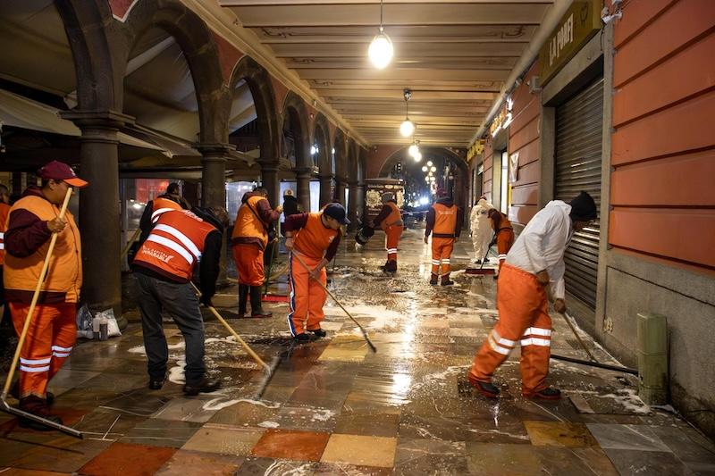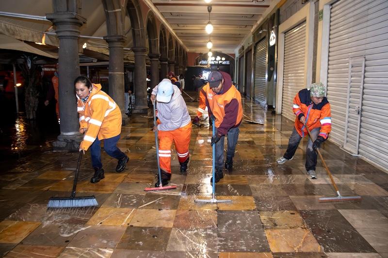 Por instrucciones del presidente municipal, Pepe Chedraui, el Gobierno de la Ciudad, a través del Organismo Operador del Servicio de Limpia, realizó el lavado integral de los portales Hidalgo, Morelos e Iturbide, que rodean el Zócalo de Puebla, como parte de una estrategia para dignificar y realzar la imagen del corazón de la capital.