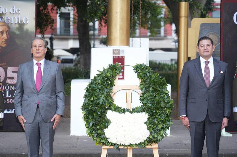 En el marco del 495 aniversario de la fundación de la ciudad de Puebla el gobernador del estado, Alejandro Armenta y el presidente municipal, Pepe Chedraui, encabezaron la ceremonia cívica conmemorativa realizada en el Zócalo de Puebla.