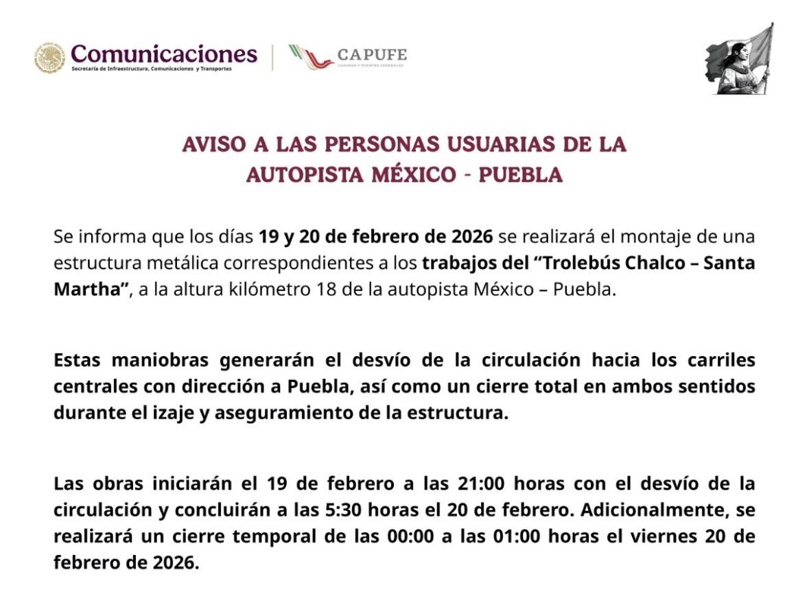 Montaje de estructura del Trolebús Chalco–Santa Martha provocará cierres nocturnos en la México–Puebla