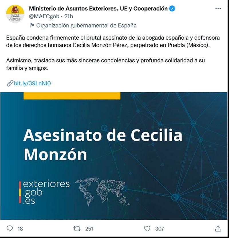 El Gobierno de España condena firmemente el asesinato de la abogada española y defensora de los derechos humanos Cecilia Monzón Pérez perpetrado el sábado 21 de mayo en el municipio de San Pedro Cholula.