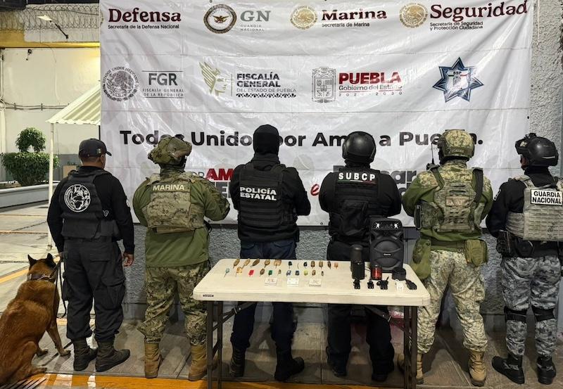 En el centro penitenciario de San Pedro Cholula y con apoyo de la Secretaría de Marina (SEMAR), Secretaría de la Defensa Nacional (DEFENSA) y Guardia Nacional (GN), se aseguraron 23 objetos punzocortantes, cinco bocinas, accesorios para equipos telefónicos y otros artículos prohibidos.